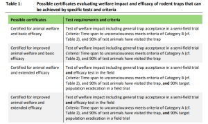La metodologia de evaluación de las trampas propuesta en la guia sigue un enfoque escalonado, que comienza con la comprobación de sus propiedades mecánicas, seguido de una prueba de semicampo, que comprueba el impacto en el bienestar animal y la eficacia básica, y opcionalmente se complementa con una prueba de eficacia extendida en el campo. Esta última prueba es comparable a la prueba de eficacia de los rodenticidas químicos, tal como se define en la guía de la ECHA para el Reglamento de Productos Biocidas. Las trampas cuya eficacia ha sido probada de manera similar a los rodenticidas pueden compararse con estos y los usuarios pueden tomar decisiones informadas sobre qué método se puede usar en cada situación para controlar mejor a los roedores.